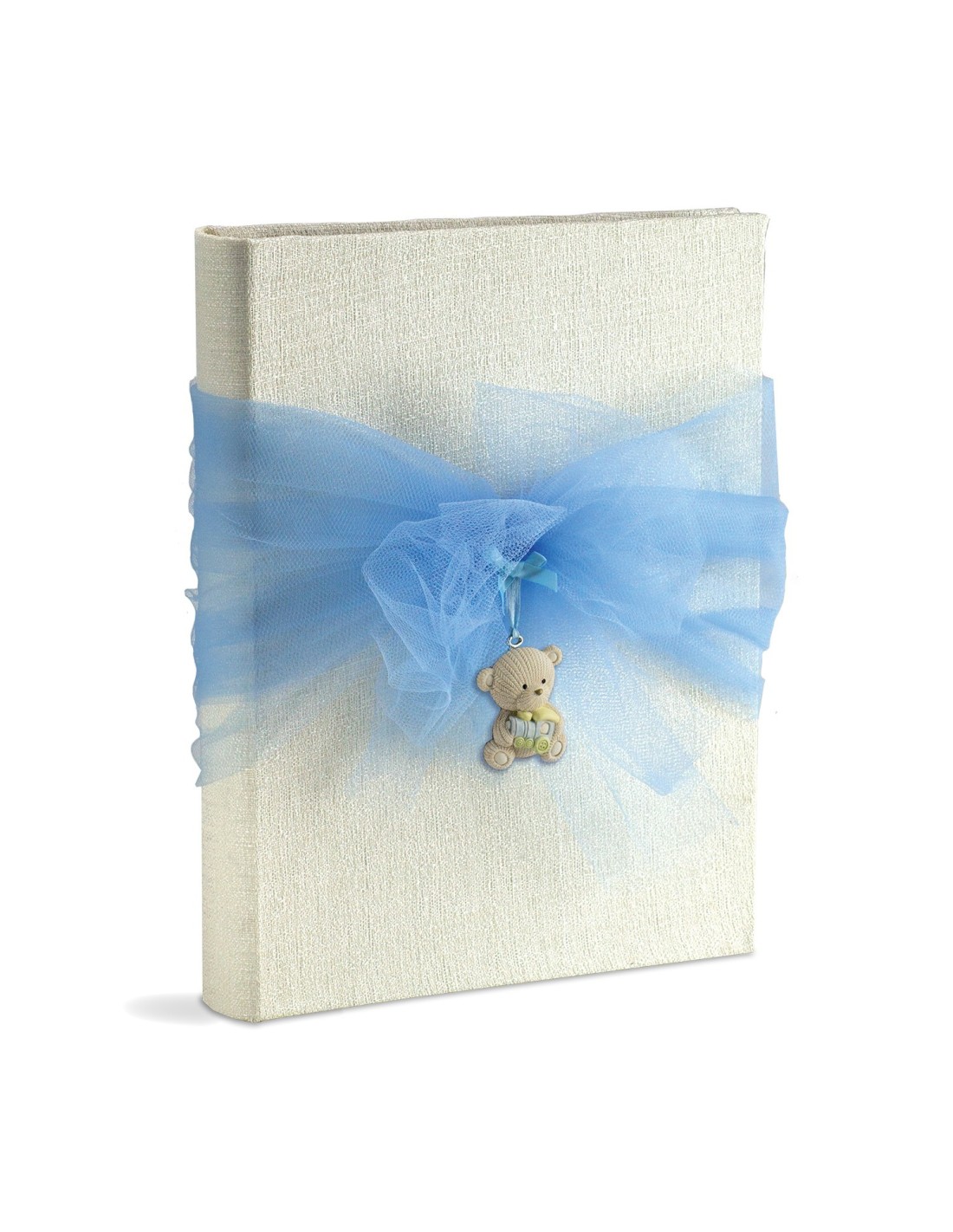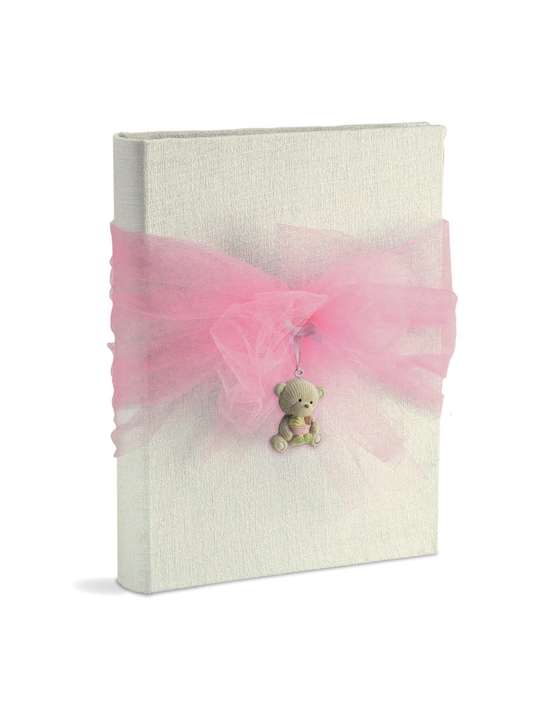 Album 23x30/30fg con pergamino, copertina in tessuto bianco goffrato, interno con 4 pagine diario personalizzabili, fiocco in tulle, applicazione orsetto in resina, imballo in scatola regalo
