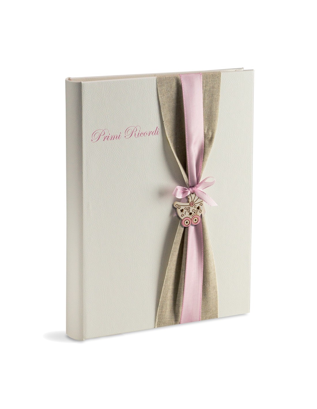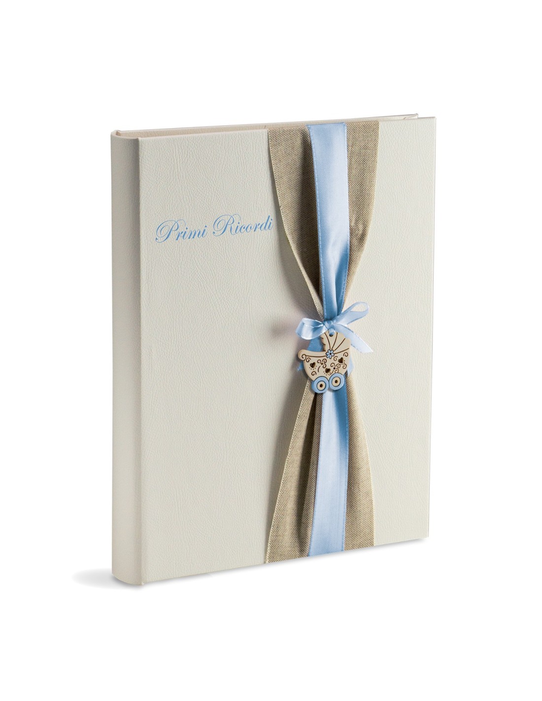 Album 23x30/30fg con pergamino, interno con 4 pagine diario personalizzabili, copertina in similpelle bianca stampata “Primi Ricordi”, fascia verticale in lino e nastrino in satin rosa o celeste, applicazione carrozzina dipinta, imballo in scatola regalo