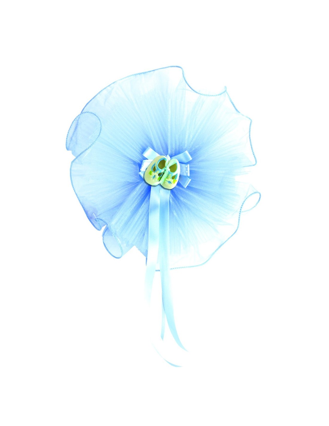 Fiocco Nascita da appendere per annunciare il lieto evento, coccarda in tulle cm 30x30 con pergamena e accessorio applicato, imballo in scatola regalo.