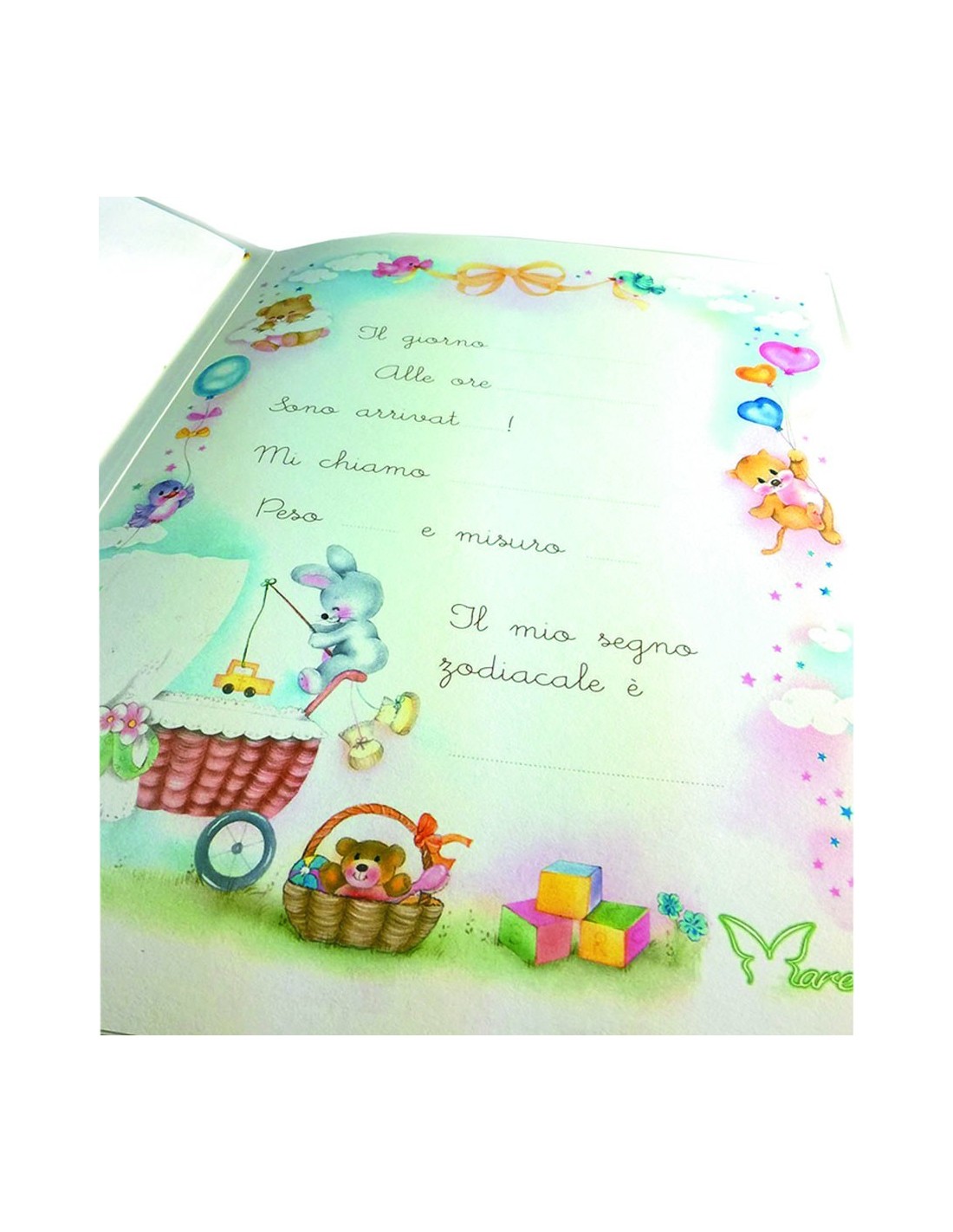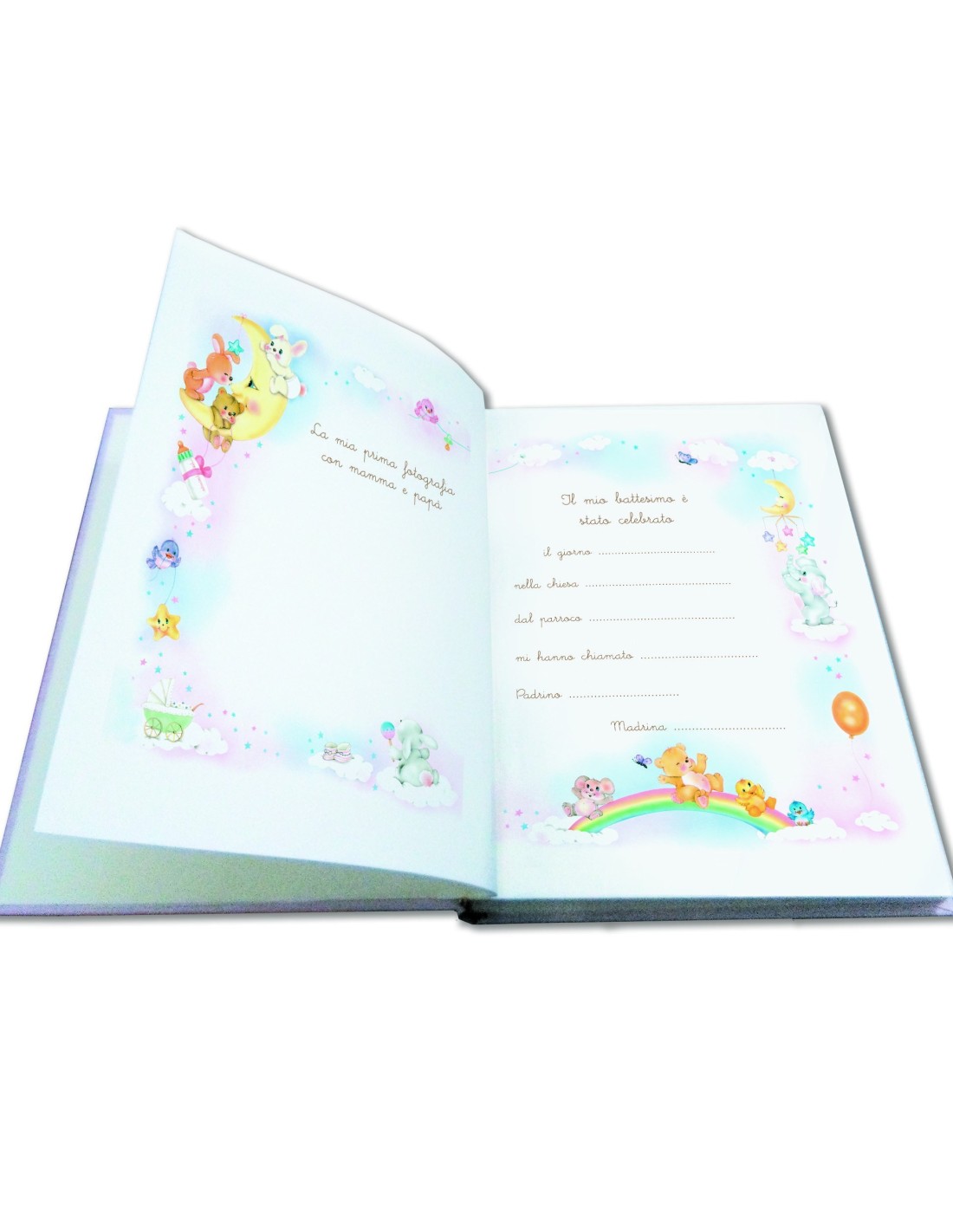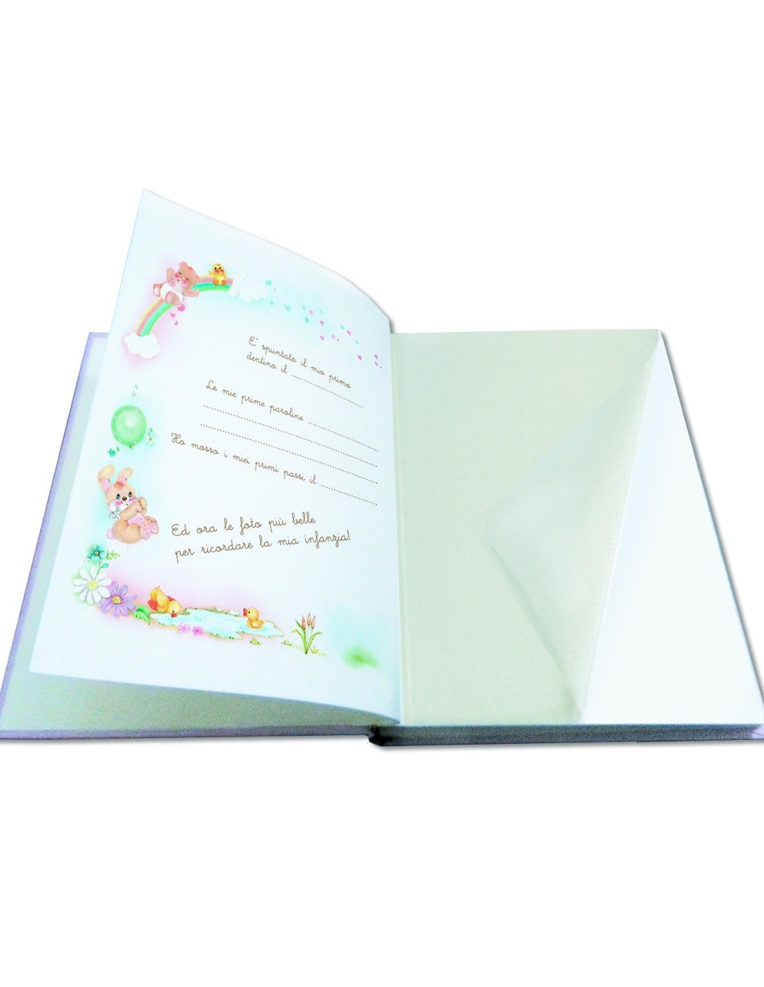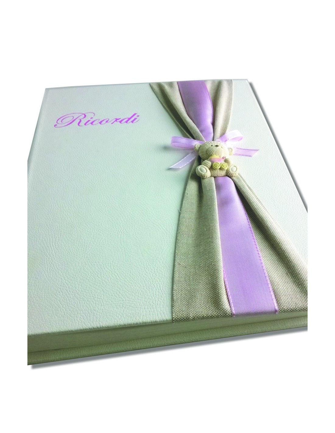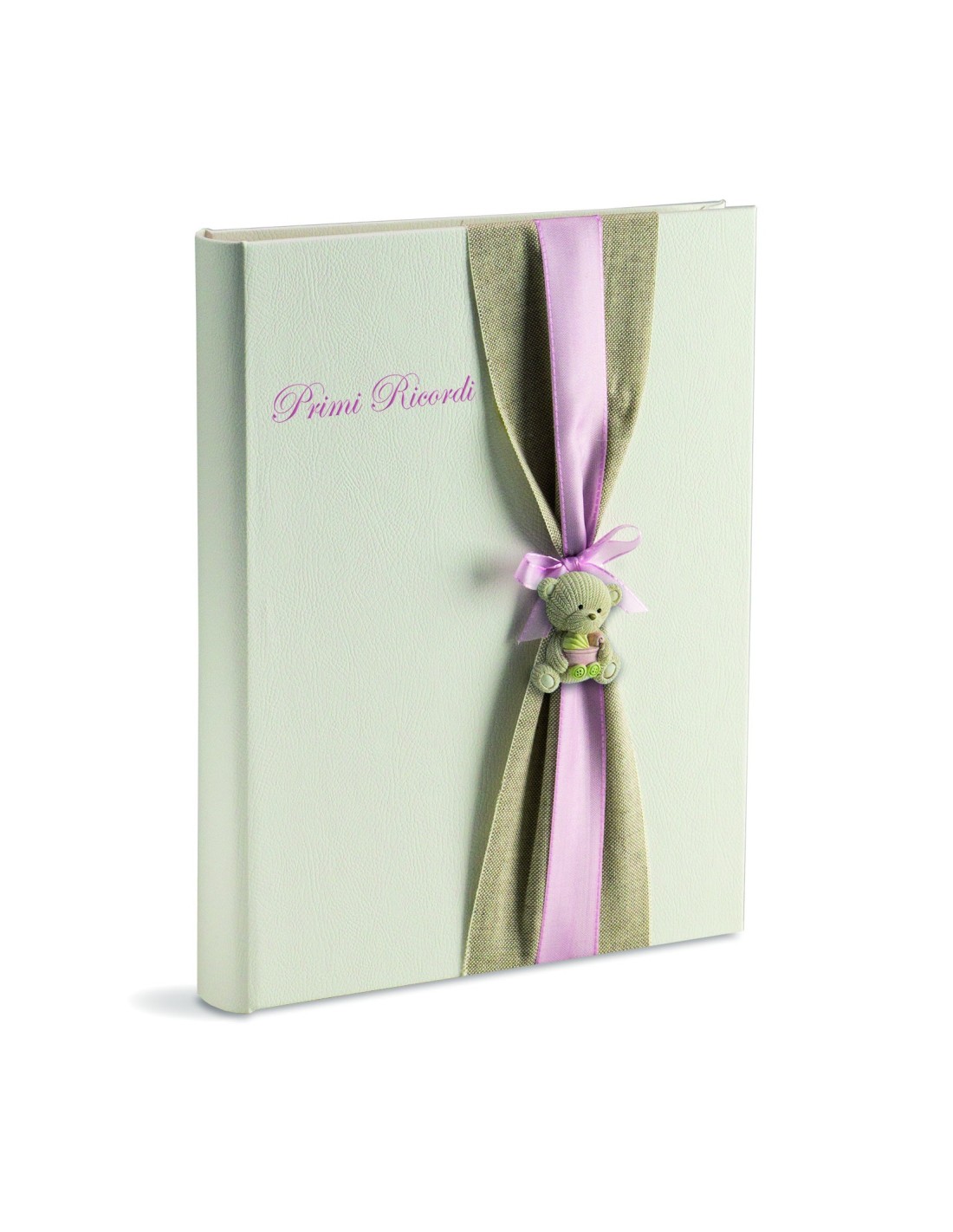 Album 23x30/30fg (60 pagine), ideale per custodire le foto del proprio bimbo. Interno con 4 pagine diario personalizzabili e 56 pagine bianche con intercalare pergamino (velina utile a proteggere le foto); copertina in similpelle bianca stampata “Primi Ricordi” in rosa o celeste, fascia verticale in lino e nastrino in satin rosa o celeste, applicazione orsetto in resina dipinta. Imballo in scatola regalo.