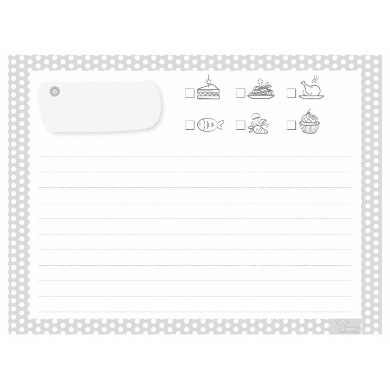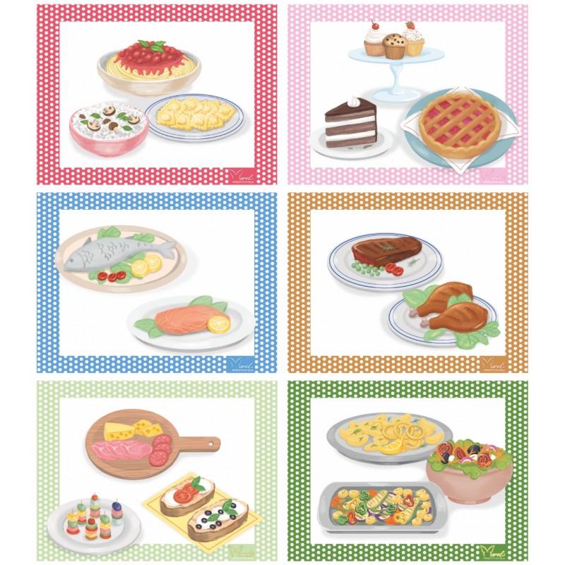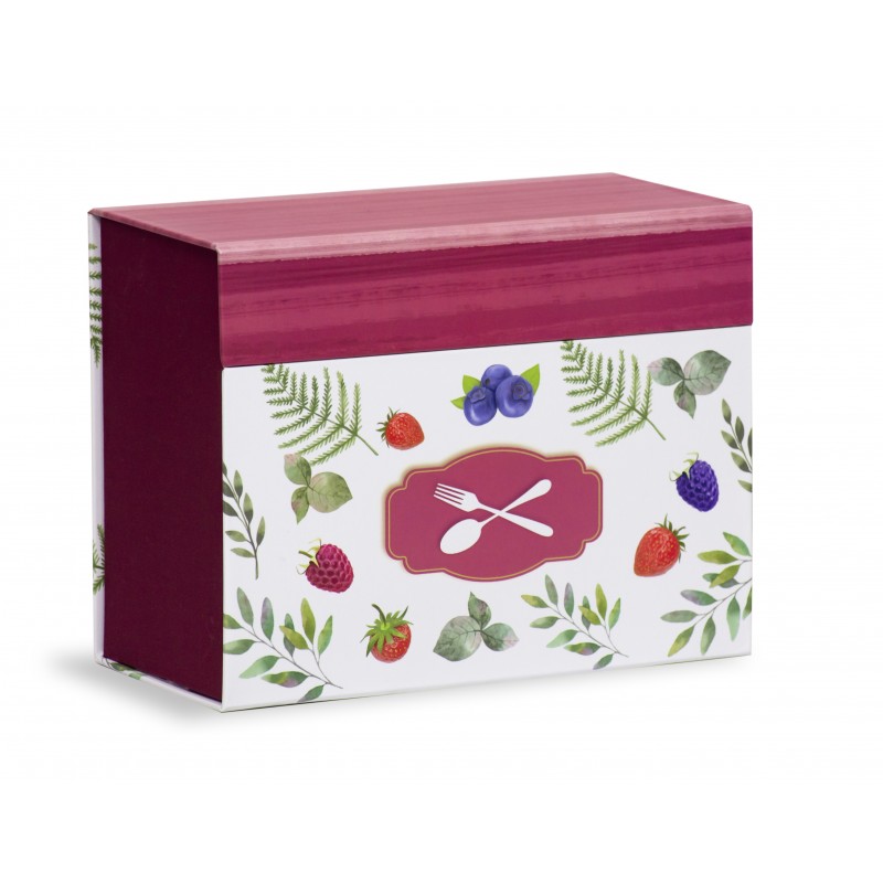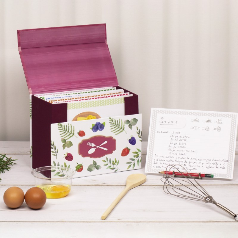 Scatola Ricettario con 60 schede illustrate da compilare con proprie Ricette e 6 divisori con Disegno pietanze, colore Bordeax, cm 22,5x11x17. Imballo in scatola Regalo.